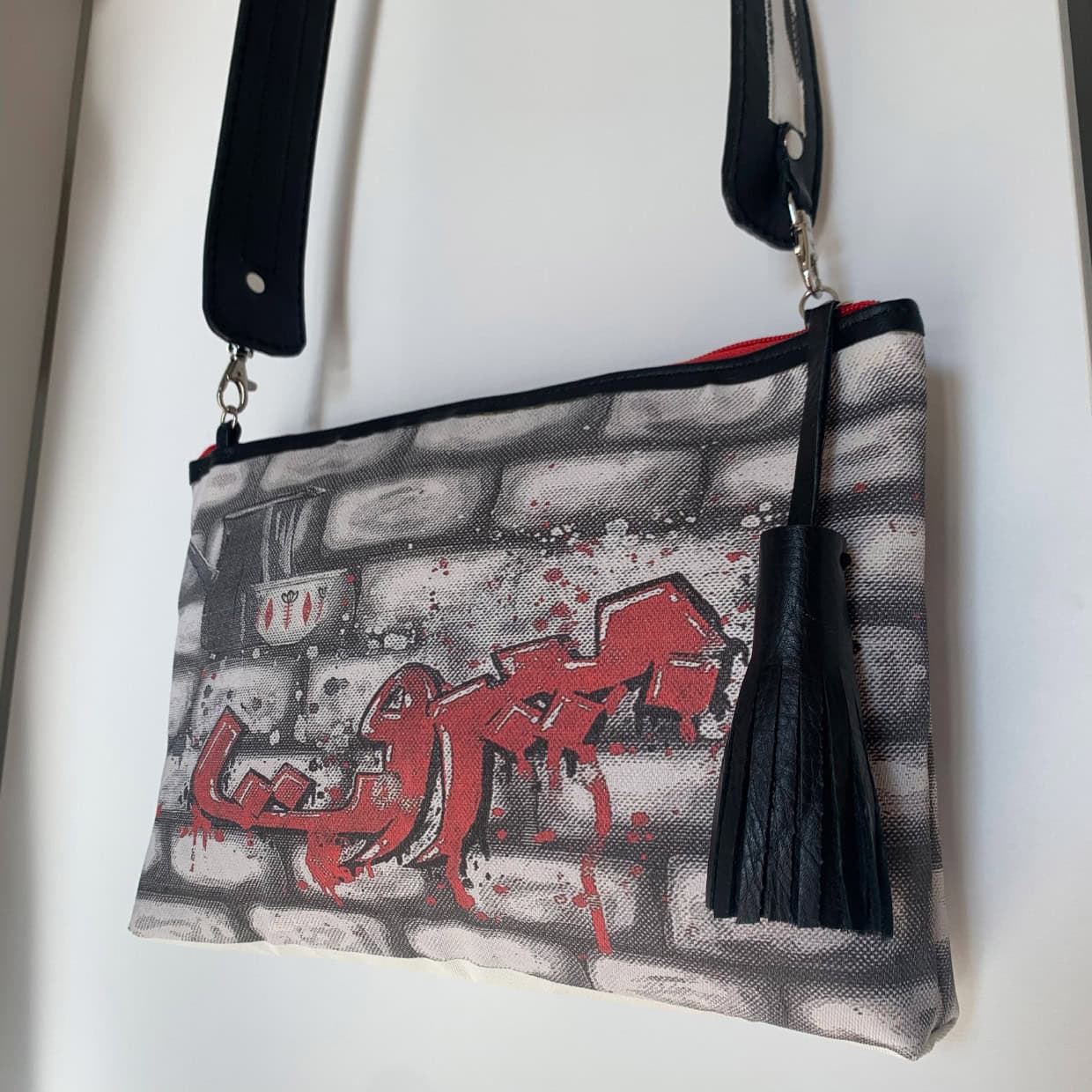 This design blends our own hand-drawn graffiti artwork printed on Joumana Dagher’s signature upcycled DURAFABRIC (leftover sunshade material) with Italian leather finishing and a unique printed shoulder strap.