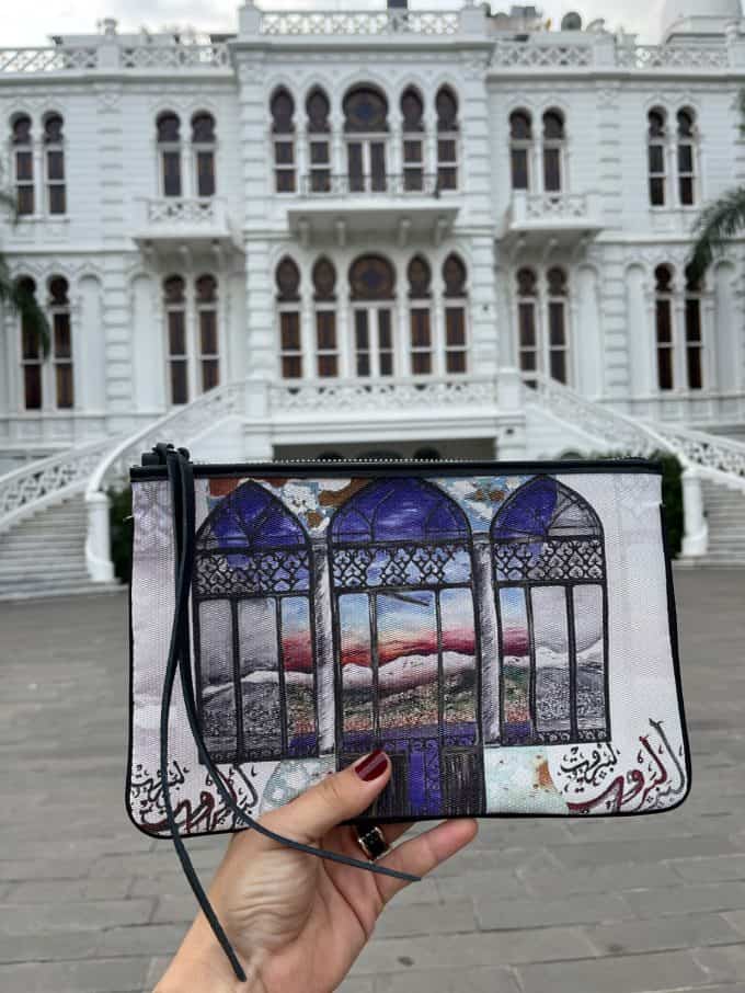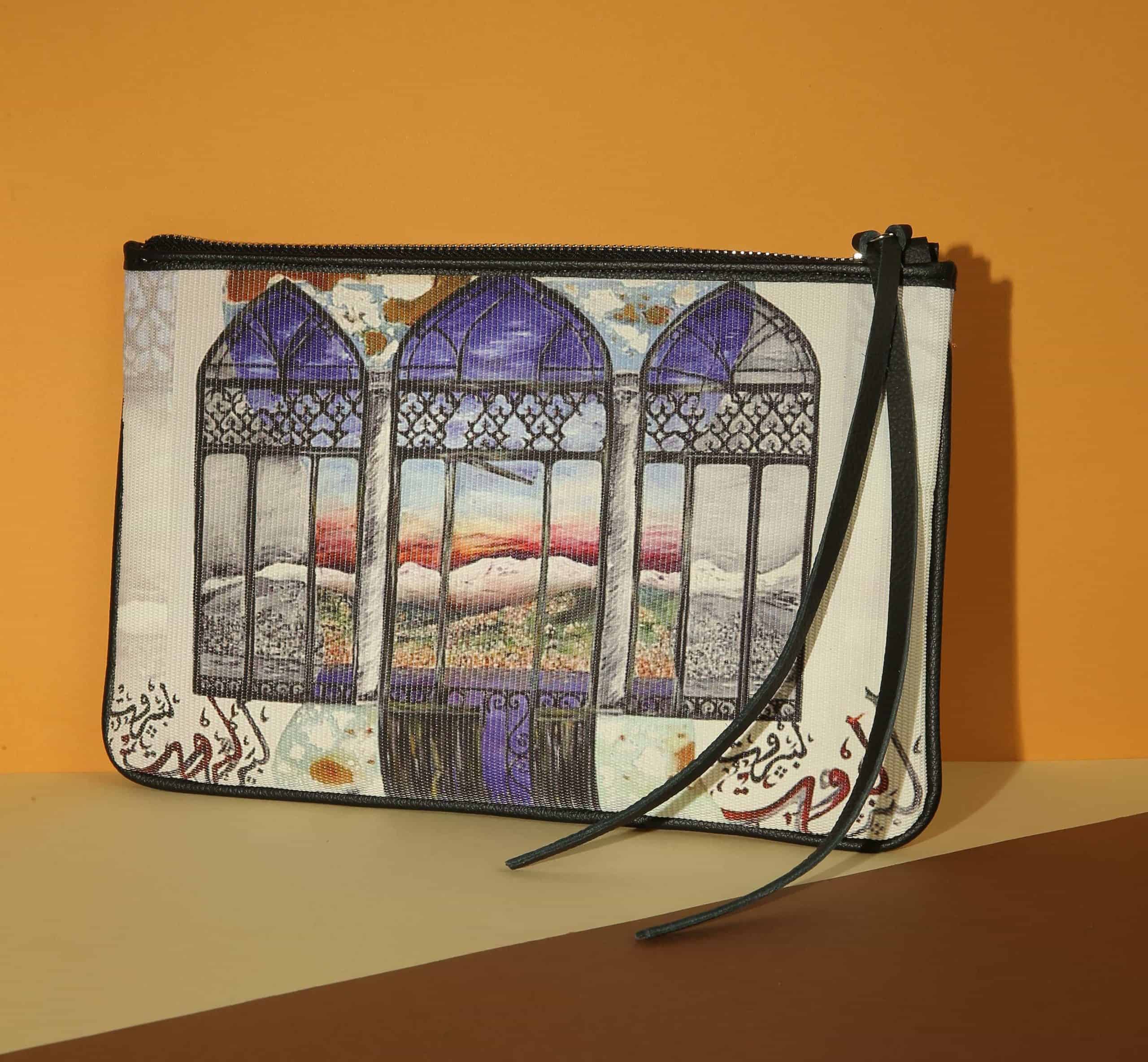From arches and colored glass to intricate ironwork this pouch captures the traditional Lebanese window as a portal to memory. Part of the collaborative collection Hommage à l’Héritage, it merges Marie-José’s illustrated vision with Joumana’s craftsmanship.