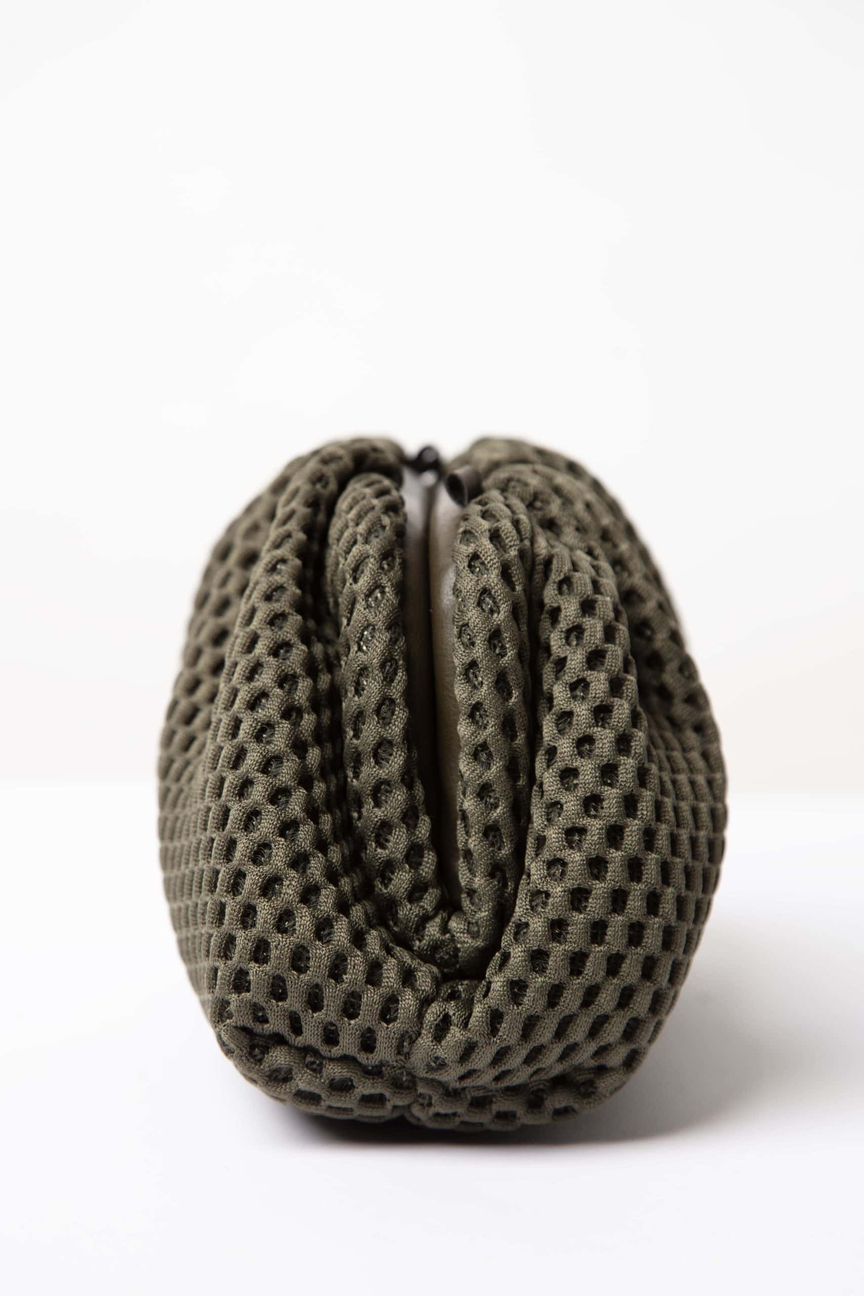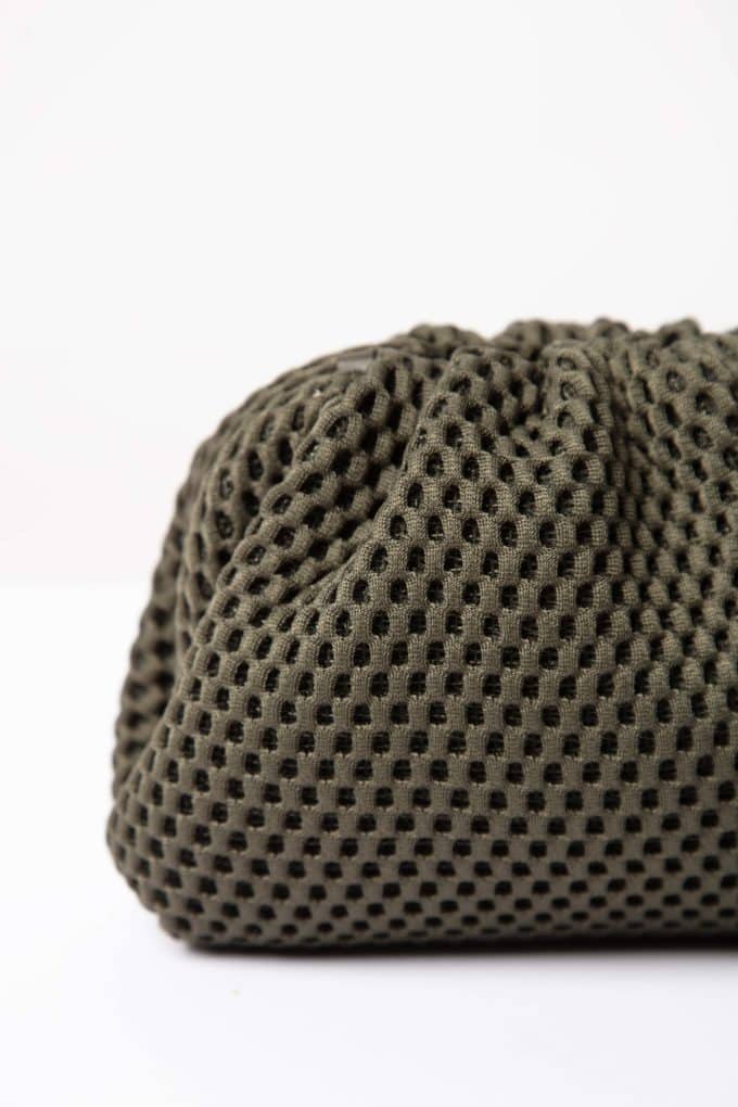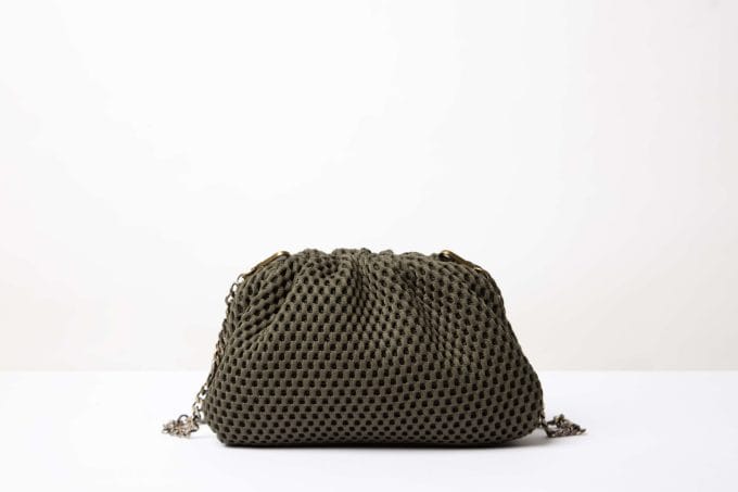 The Mini TicToc Olive Mesh Edition brings a new texture to one of Joumana Dagher’s most iconic pieces. Its softly gathered silhouette meets a tactile mesh fabric, creating a subtle play of shadow and light.