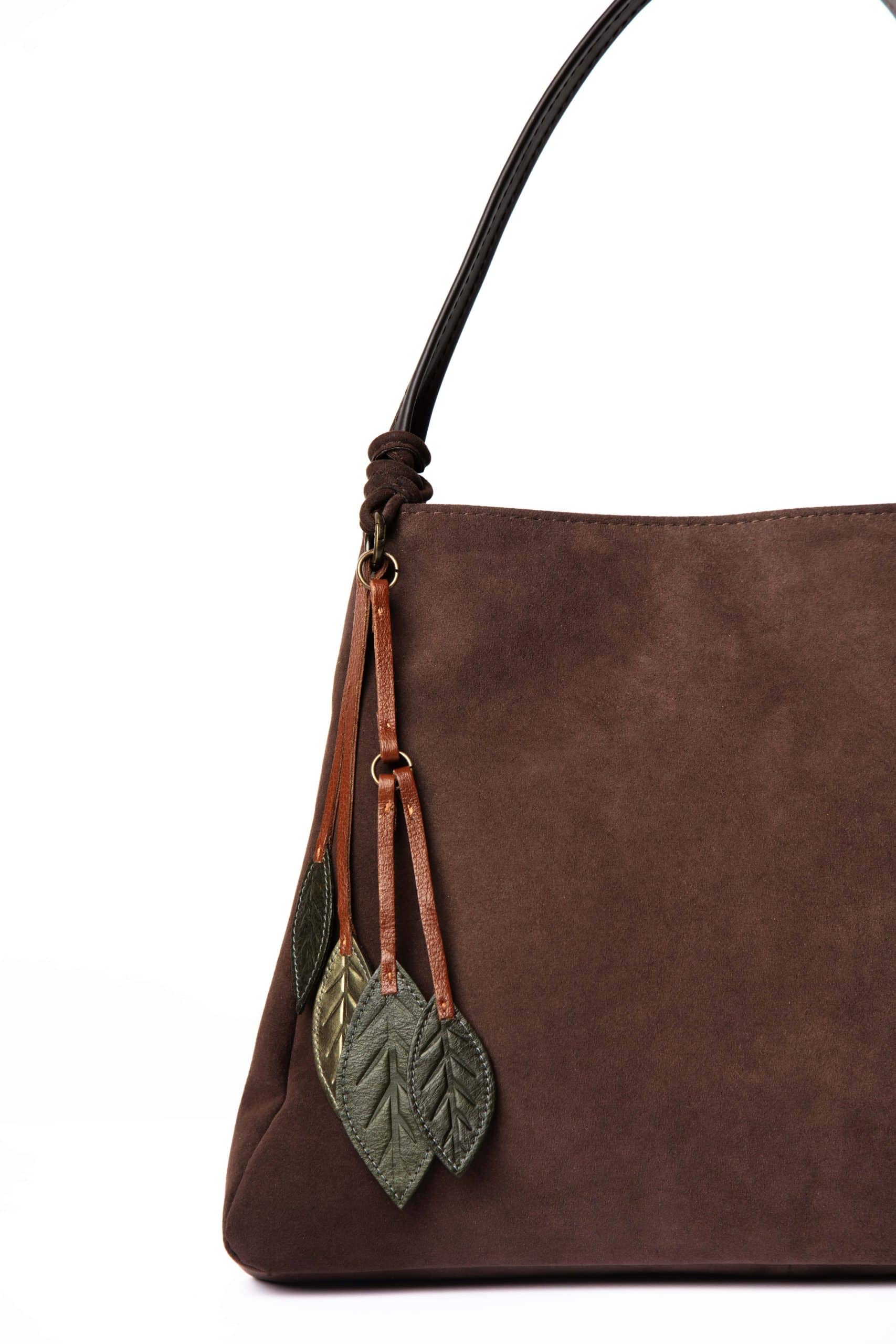 Soft nubuck leather bag with olive-leaf charms, minimal, timeless, and sustainably crafted in Lebanon.