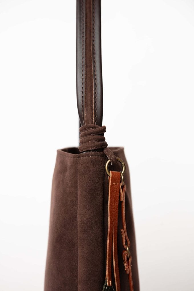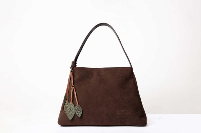 Crafted from leftover Italian nubuck leather — soft, matte, and velvety to the touch. The handle and olive-leaf charms are made from surplus Italian smooth leather, each leaf symbolizing resilience and rebirth.