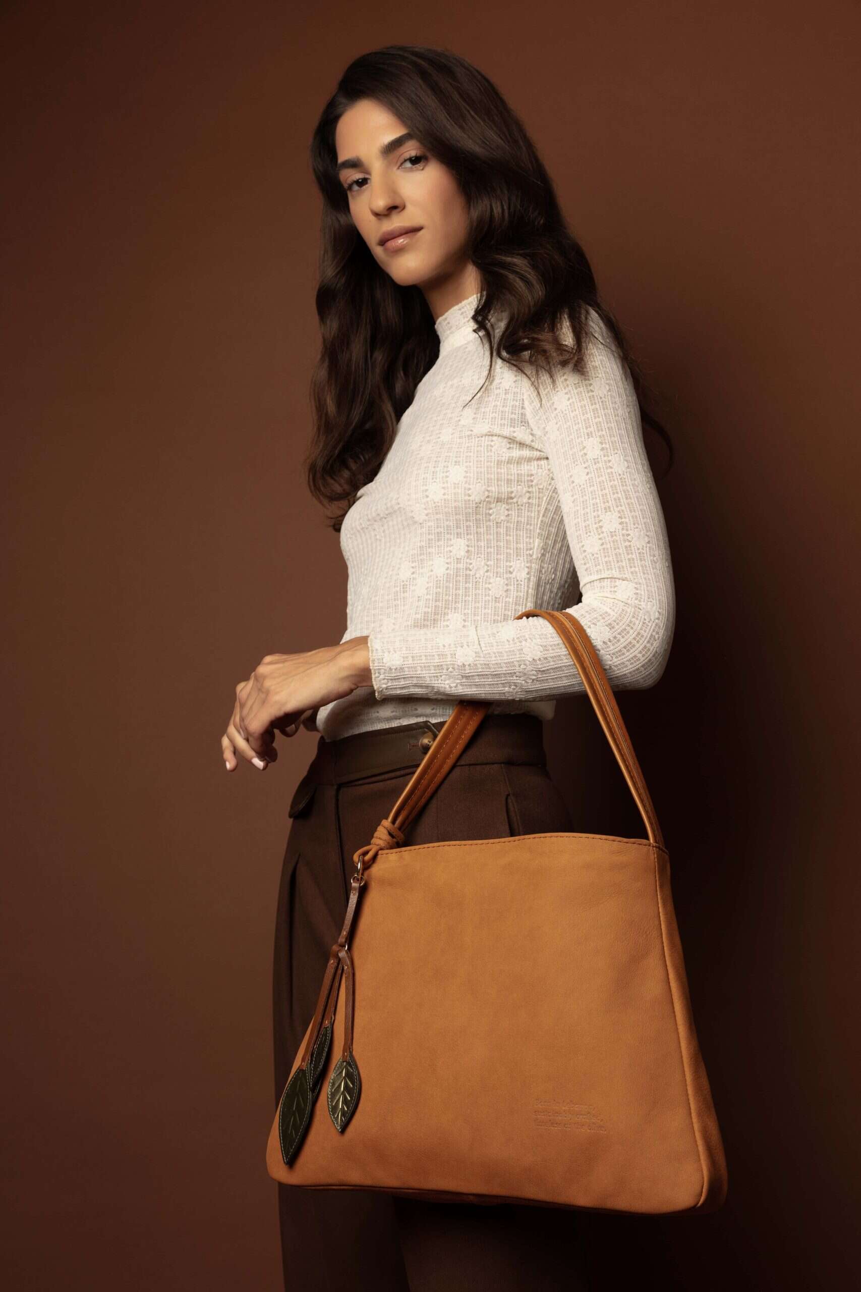 The Olivia Nubuck bag captures the timeless elegance of simplicity. Designed with soft geometric lines and a single knotted handle, it embodies the calm strength of the olive tree. Each bag carries hand-cut leather leaves, a tribute to nature and to sustainable craftsmanship. Its texture, warm and tactile, tells the story of material reborn leftover nubuck transformed into quiet sophistication.