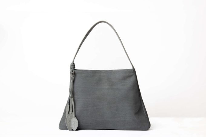 Crafted from leftover Italian nubuck leather — soft, matte, and velvety to the touch. The handle and olive-leaf charms are made from surplus Italian smooth leather, each leaf symbolizing resilience and rebirth.