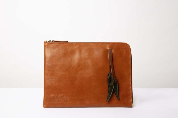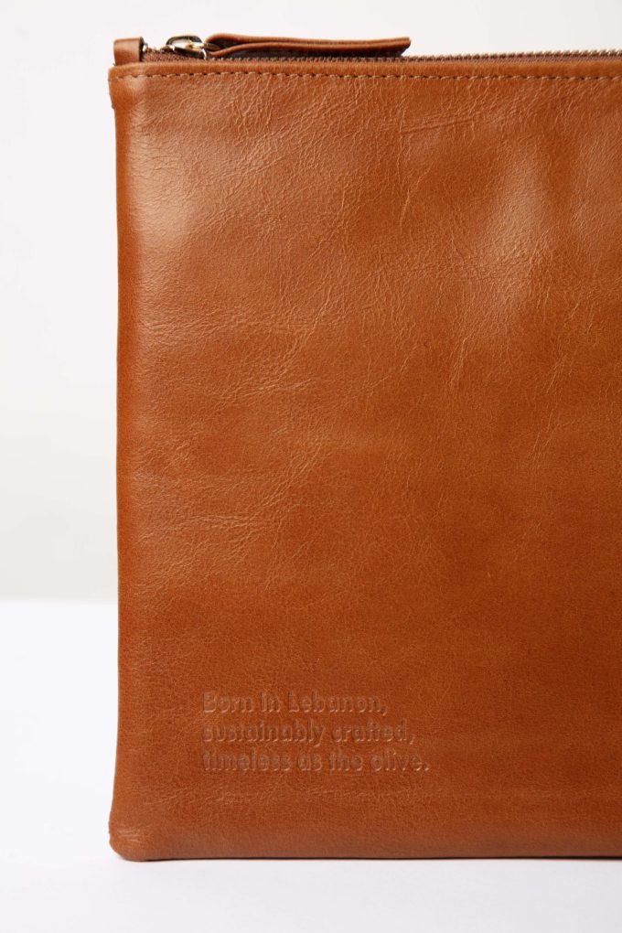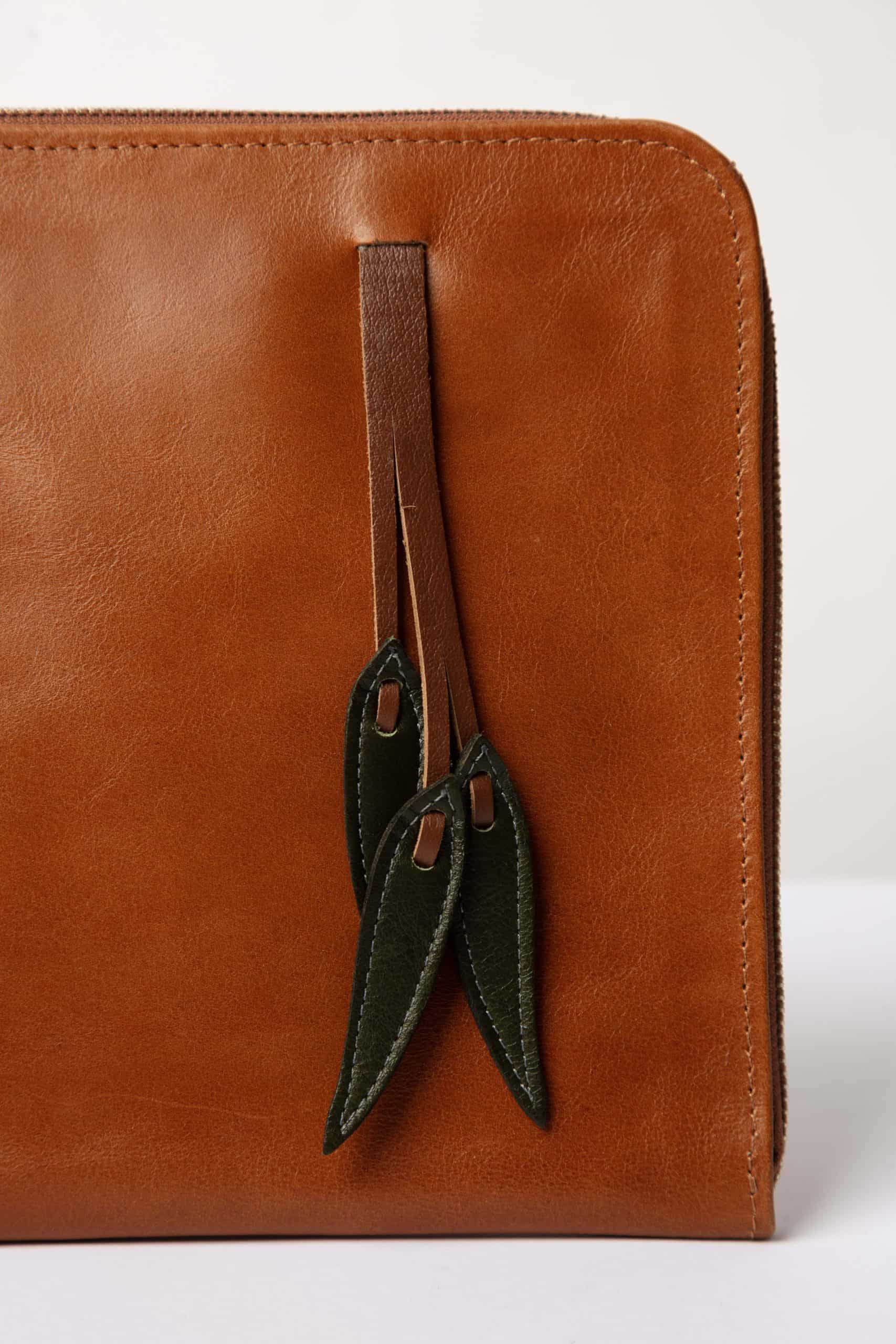 Crafted from second-life Italian leather, soft, smooth, and naturally patinated. Features olive-leaf leather detailing, recycled-fabric lining, a full zipper opening, and labeled interior compartments (Phone, Glasses, Key) for intuitive organization.
