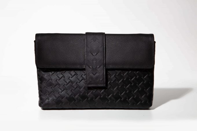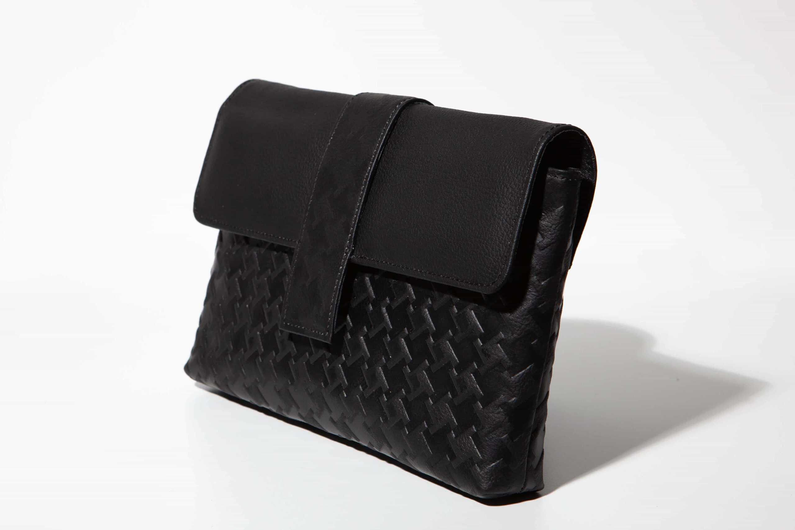 Pixel-embossed leather shoulder bag — a graphic dream in camel or black. Made to order.