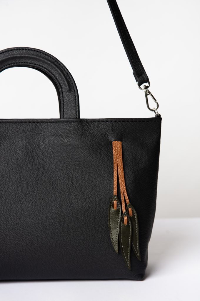 Made from surplus Italian leather with a natural semi-matte finish. Lined with durable recycled fabric. Features olive-leaf charms crafted from upcycled leather.